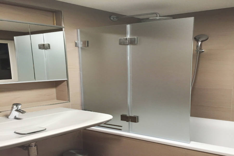 Für Badewannenaufsatz wird Einscheibensicherheitsglas (ESG) eingesetzt, da es speziell für den Einsatz im Nassbereich entwickelt ist und höchste Sicherheitsanforderungen erfüllt: